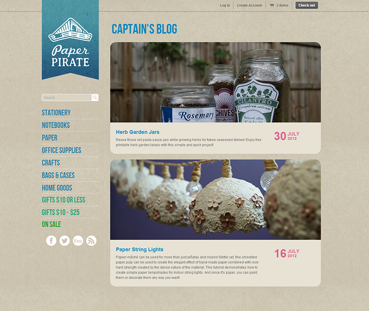 The Paper Pirate website was designed to organize stationery and paper goods for sale. The homepage footer is unique to the other pages as it includes updated information such as a blog, recent Twitter entries, and an option to subscribe to the newsletter. The homepage also included a rotating banner to advertise featured products.